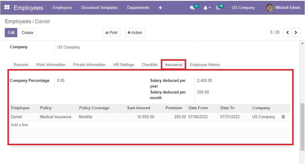 For example, we can create a Medical Insurance request for the employee Mr. Daniel. So let us select the Employee, Mr. Daniel, the Policy Coverage can be set as Monthly, and the Policy can be mentioned as Medical Insurance. Finally, the Sum Insured and the Premium amount can de be defined in the provided space. If you are given all the details, click on the Save button to save the details. The employee Insurance request was created for Mr. Daniel and is in the Active state, and the status will be displayed in the top right corner of the window.