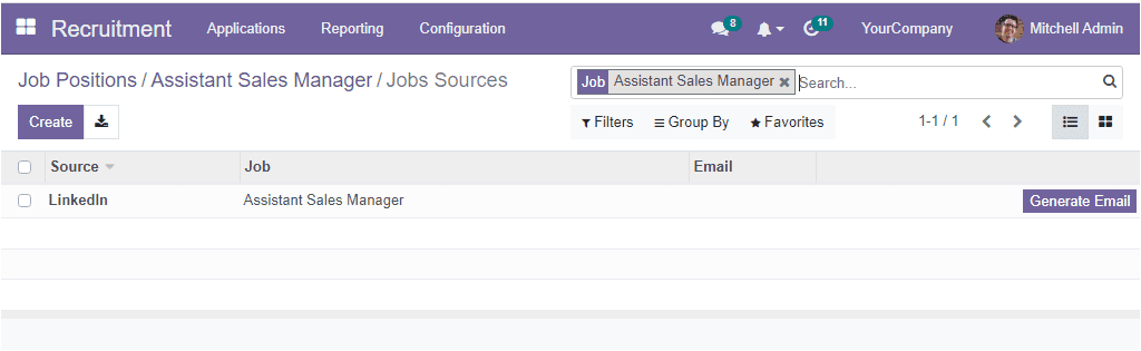 When you open the HR Recruitment module, the application welcomes you with a Job Positions window, as portrayed below.