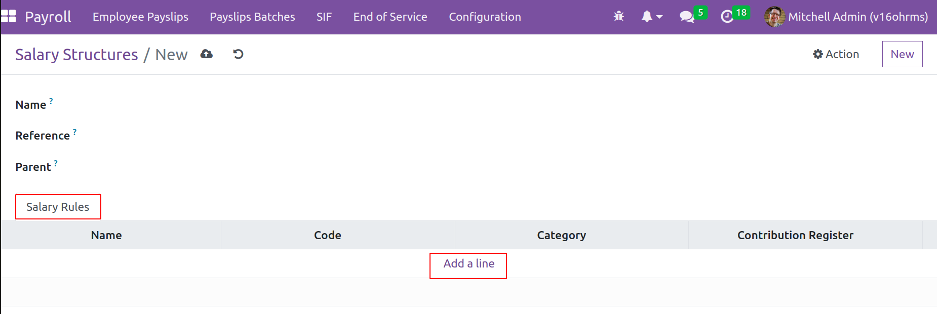 A new popup window, resembling the salary rule setup window, will open when the add a line option is clicked, allowing the addition of child rules.